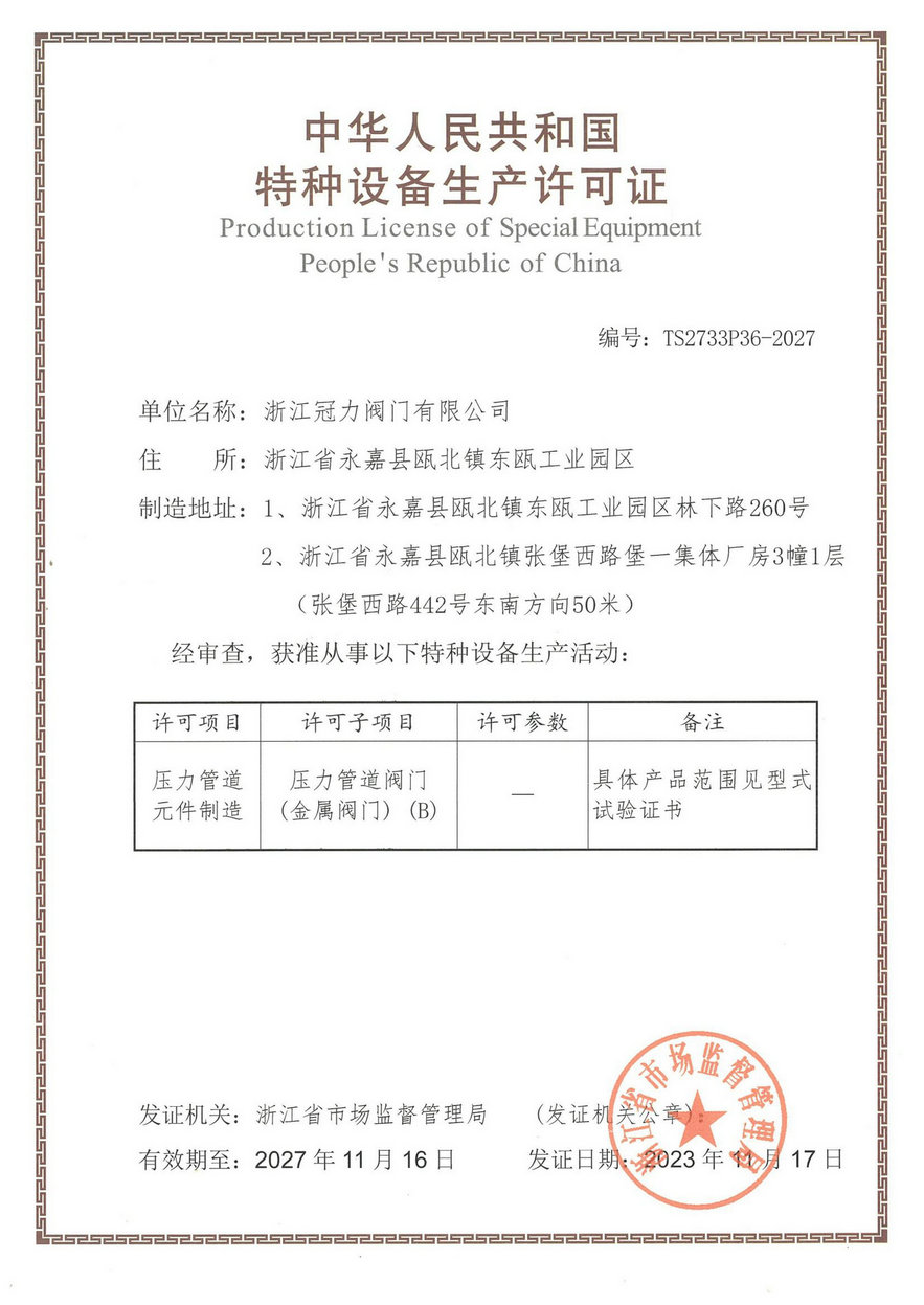 浙江冠力閥門(mén)有限公司是一家集閥門(mén)設計、研發(fā)、制造、銷(xiāo)售于一體的現代化企業(yè)。公司擁有一批高素質(zhì)的人才隊伍,科學(xué)規范的管理體系。我公司主要產(chǎn)品有刀閘閥,V型球閥,礦漿閥,漿液閥,美標閥、閘閥,閘門(mén),截止閥,止回閥,蝶閥,球閥等,并可根據用戶(hù)要求制造各種特殊閥門(mén)。公司先后取得了CE,ISO9001,TS,API,ISO1400,ISO1800等各項認證。